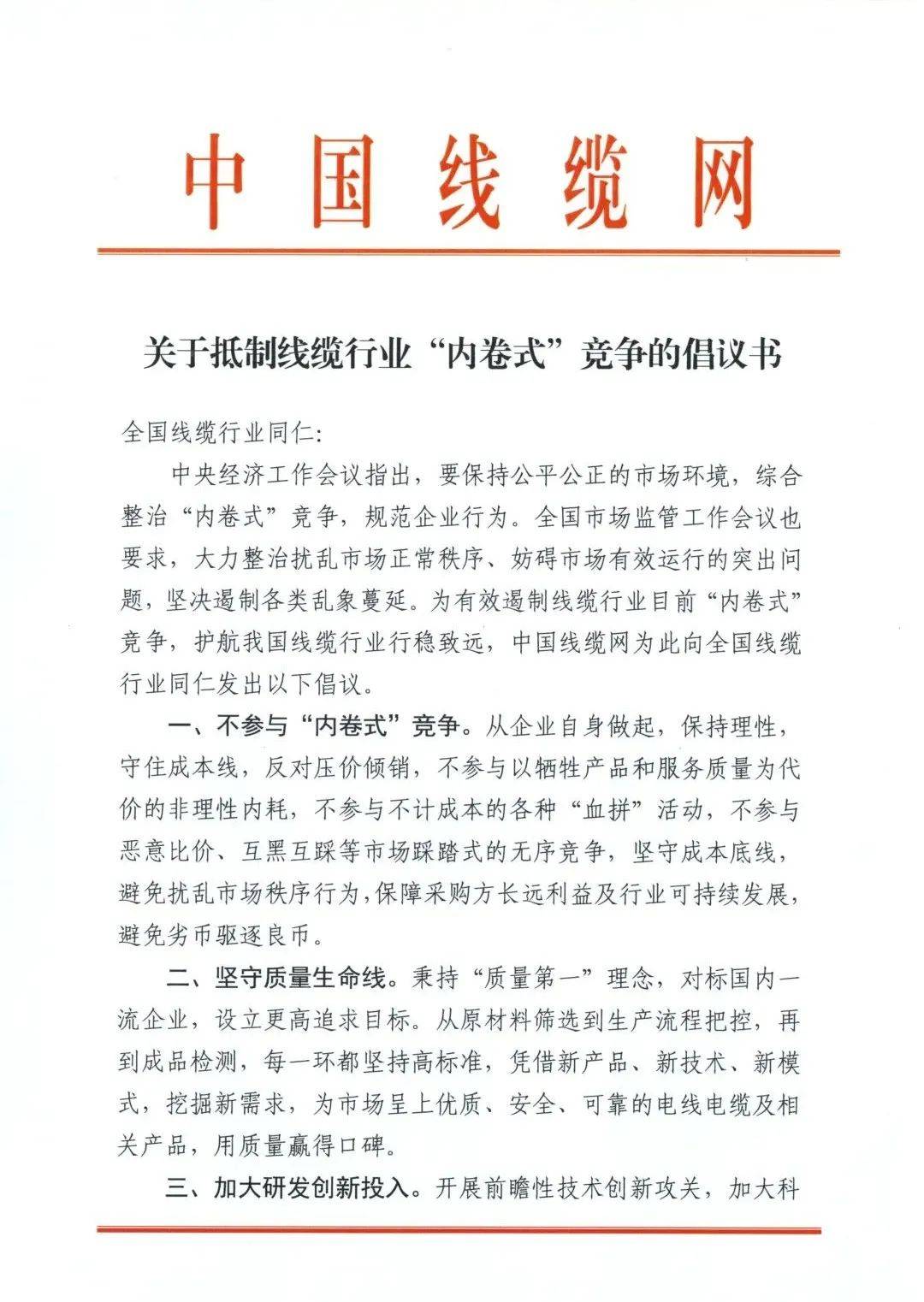 如今,電線電纜行業(yè)“內(nèi)卷式”競(jìng)爭(zhēng)問(wèn)題日益突出。它像一個(gè)無(wú)形的漩渦,將諸多參與者卷入一場(chǎng)不計(jì)成本的非理性內(nèi)耗之中,不僅給企業(yè)自身的健康發(fā)展戴上了沉重枷鎖,更對(duì)諸多行業(yè)的穩(wěn)健前行乃至整個(gè)經(jīng)濟(jì)生態(tài)造成了負(fù)面影響。今日,中國(guó)線纜網(wǎng)向全國(guó)線纜行業(yè)同仁發(fā)出《關(guān)于抵制線纜行業(yè)“內(nèi)卷式”競(jìng)爭(zhēng)的倡議書(shū)》,呼吁抵制“內(nèi)卷式”競(jìng)爭(zhēng),倡導(dǎo)行業(yè)自律,攜手推動(dòng)高質(zhì)量發(fā)展。